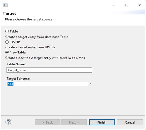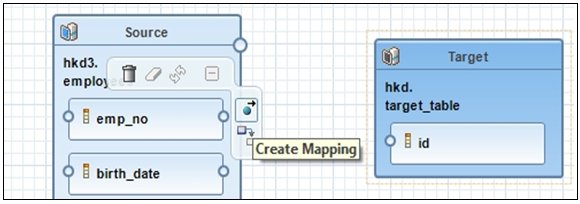 Creates the target entry in the selected schema and database with the selected columns. Selecting this option will open the New Source Table dialog. Selecting a table name in this dialog will write the contents of the mapper to the table. |