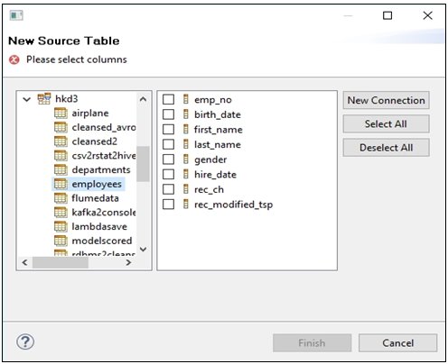 The New Source Table dialog enables you to navigate and select the Hive table that you want to transform.