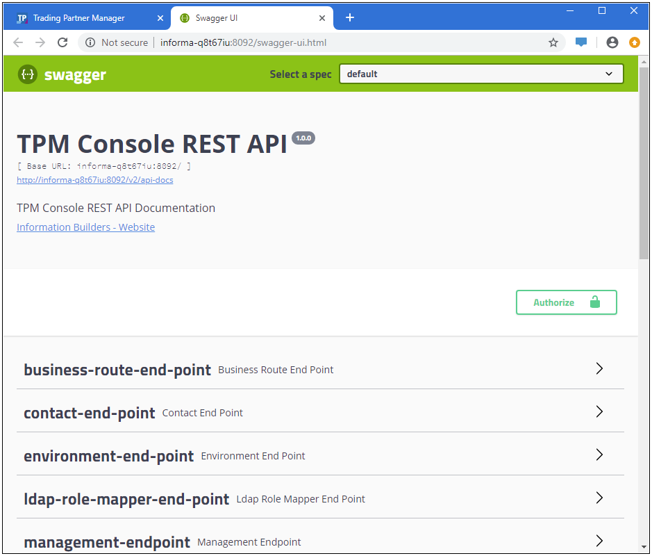 The TPM Console REST API opens in a new browser tab, as shown in the following image.