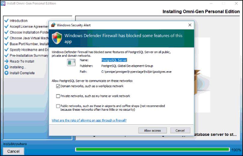 During installation of Omni-Gen™ Personal Edition, you may encounter a message from Windows Defender or similar protection applications to allow access for PostgreSQL server and other Omni-Gen™ Personal Edition services. The following image is a sample that you may encounter from Windows Defender, where you are advised to select the Allow access option.