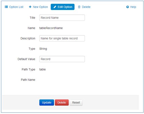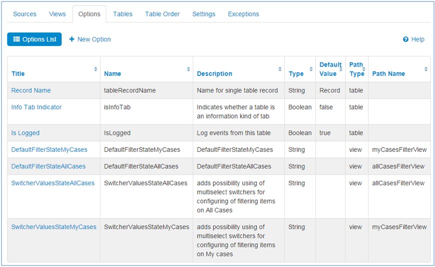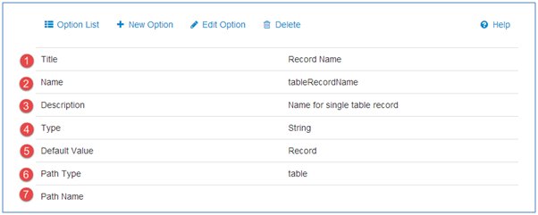 Options can be added for a table, source, or view. Each of these elements can store a custom value for the option. Currently, options are used to:
