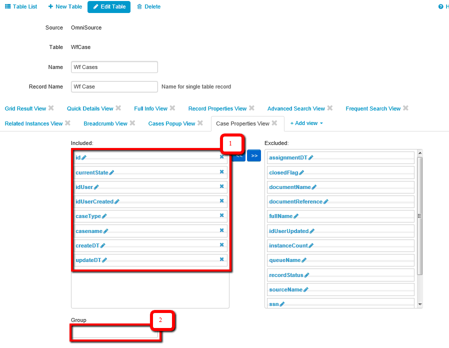 Another thing that can be configured Manual Cleansing page is Case Properties panel. Administrator should find WF Cases table in the list of tables. The view that is needed to be configured is called Case Properties View.