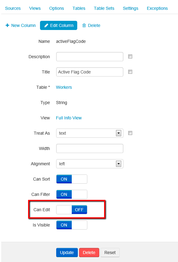 To configure the ability to edit the fields in the workspace panel administrator should edit nested columns (for example, display name, sortable, filterable). This can be done via clicking the 'Pencil' icon for appropriate columns in the Full info view of appropriate table and updating corresponding option: