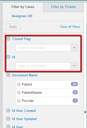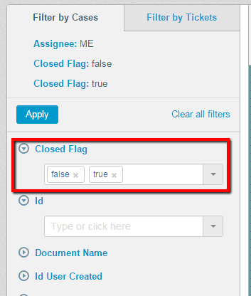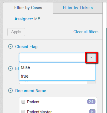If there are a lot of filtering items under a filtering parameter (for example, many IDs of cases) or to filter parameters to be displayed other than the default settings, you can change the check box list to a simple drop-down menu. This functionality is added for better UI representation of a long-list of values. For example, the following image shows configured columns for both ID and Closed Flag to be displayed as drop-downs lists.