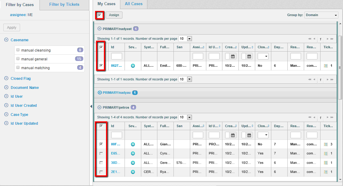 When any value is selected from the Group By drop-down list, grids get re-grouped by the proper parameters. Cases are grouped by Domain, by default.