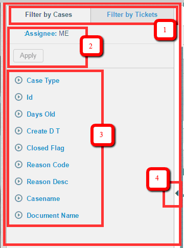 Filtering in the My Cases and All Cases tabs are independent from each other. Filtering by tickets is dependent on filtering by cases. For example, after applying a filter by cases, the only criteria that satisfies the already applied filtering by cases will be available in the Filter by Ticket tab.