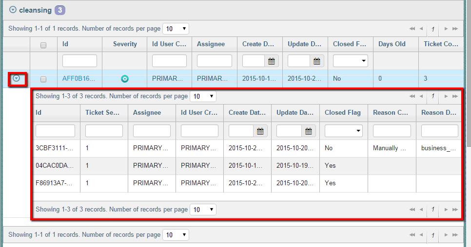 To view information about tickets within the case, click the expand icon corresponding to the appropriate row. It will expand the inline grid, as shown in the following image: