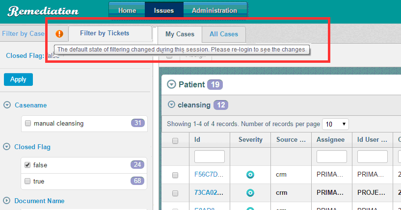 Note: If the Administrator changes the default filters while other users are currently working in the application, a warning notification icon with the appropriate message will appear. Users must login again in order for changes to be applied.