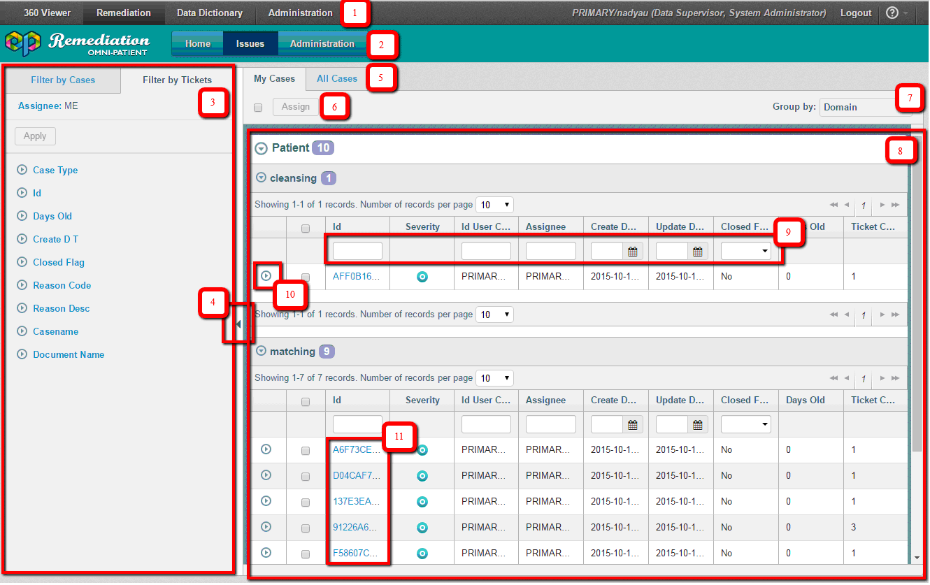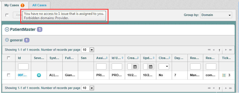 If you have issues from inaccessible domains in your queue, a notification icon will be displayed on the My Cases tab. You will not be able to view or work with those issues, but the Administrator can give permissions to work with certain domain(s) or reassign issues to someone else.