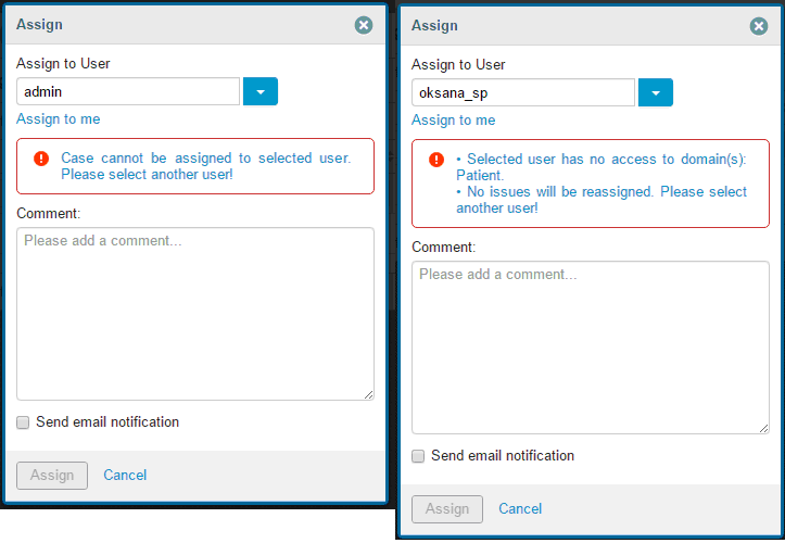 If a case cannot be assigned to the user selected from the list (for example, because the selected user has no permissions to resolve an issue or no permissions to work with some domain, and so on), or if the entered data finds no matches in the database, the appropriate validation message is displayed.