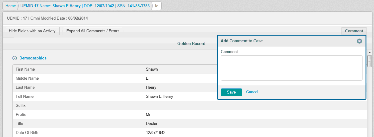 The User may comment on any data attribute. When the User rolls over the Original Data value or label the "Add comment" icon is displayed. When the User clicks on the icon the "Add comment" overlay is displayed.