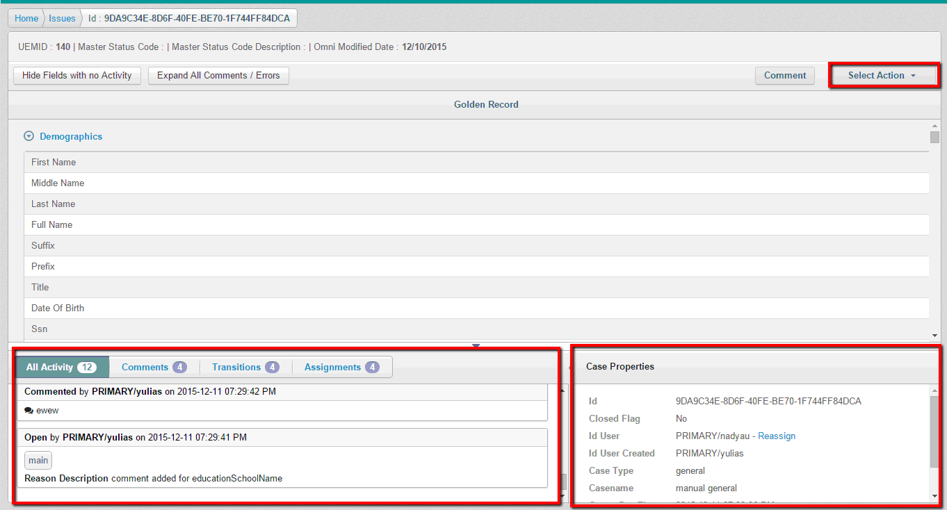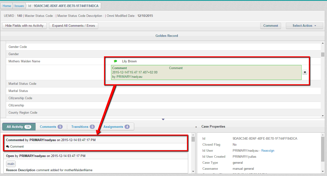In order to create General Issue case comment should be added to any field. After the case is created, the Activity Stream and Case Properties sections get refreshed and display relevant information. The Case Properties section can be configured using the Administration tab. A Workflow actions drop-down appears as well (only for Data Steward and Data Supervisor roles).