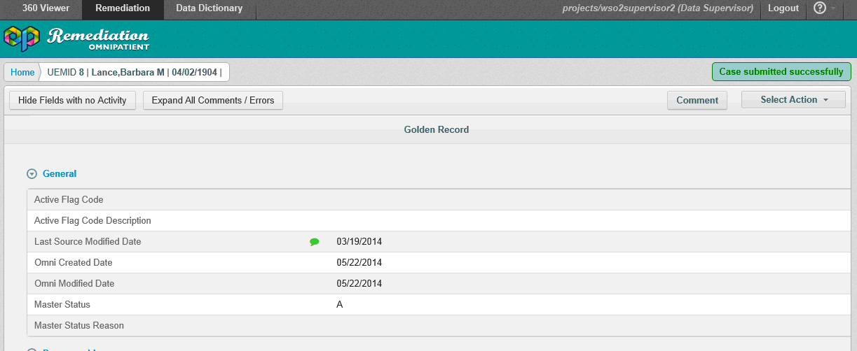 In order to submit a case to the workflow user (only with Data Steward or Data Supervisor role) should select appropriate workflow action from the drop down and submit it ("Submit" button appears after workflow action is selected).