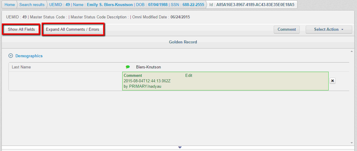 Once clicked – buttons change their names: 'Hide fields with no Activity' -> 'Show All fields', 'Expand all Comments/Errors' -> 'Collapse all Comments/Errors', so a user can decide what they want to view.