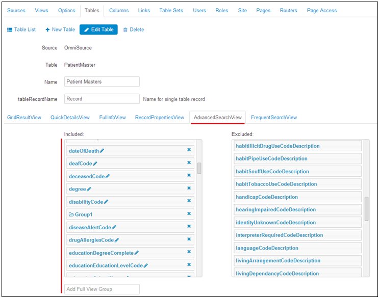 To configure search fields and their corresponding attributes that are displayed in Omni-Patient 360 Viewer for the Advanced Search page (except frequently searched), edit the table and include or exclude the required fields in the AdvancedSearchView tab, as shown in the following image.