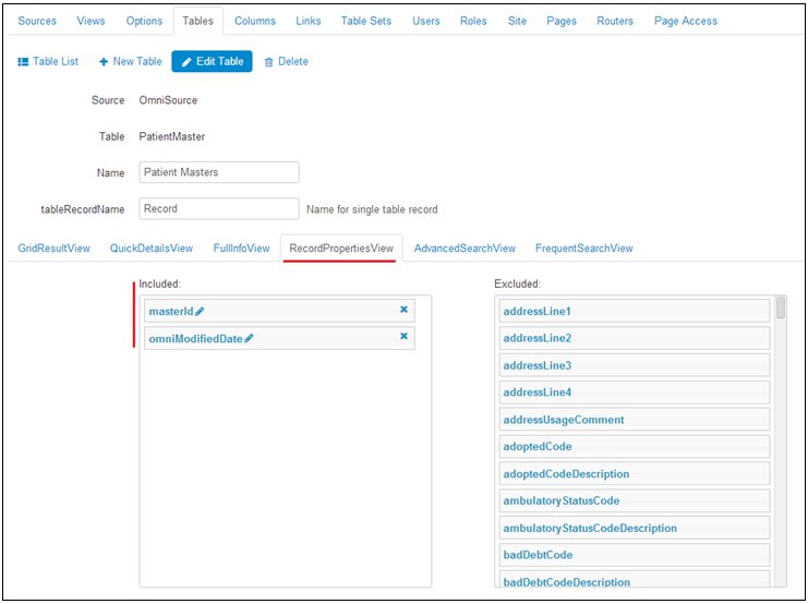 To configure attributes that are displayed in Omni-Patient 360 Viewer for the Record Properties section, include or exclude the required columns in the RecordPropertiesView tab, as shown in the following image.